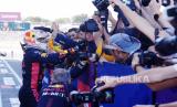 Pembalap Formula Satu Belanda Max Verstappen dari Red Bull Racing melakukan selebrasi setelah memenangkan Grand Prix Formula Satu Jepang di arena pacuan kuda Sirkuit Suzuka di Suzuka, Jepang, Ahad (24/9/2023). (FOTO : EPA-EFE/FRANCK ROBICHON)