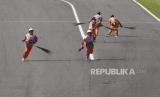 Puing-puing dibersihkan setelah terjadi kecelakaan saat dimulainya Grand Prix Formula Satu Jepang di Sirkuit Suzuka, Suzuka, Jepang tengah, Ahad (24/9/2023). (FOTO : AP Photo/Toru Hanai)