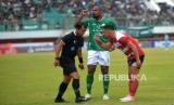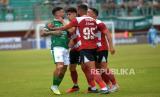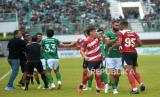 Insiden kericuhan antara pemain PSS Sleman dengan Madura United M Risaldi pada pertandingan pekan ke-13 BRI Liga 1 2023/ 2024 di Stadion Maguwoharjo, Sleman, Yogyakarta, Ahad (24/9/2023). PSS Sleman harus berbagi poin dengan Madura United usai bermain imbang 1-1. Madura United masih kokoh di puncak klasemen BRI Liga 1 dengan 27 poin dari 13 pertandingan. (FOTO : Republika/Wihdan Hidayat)