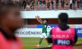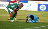 Selebrasi penyerang PSS Sleman, Hokky Caraka usai membobol gawang Madura United pada pertandingan pekan ke-13 BRI Liga 1 2023/ 2024 di Stadion Maguwoharjo, Sleman, Yogyakarta, Ahad (24/9/2023). PSS Sleman harus berbagi poin dengan Madura United usai bermain imbang 1-1. Madura United masih kokoh di puncak klasemen BRI Liga 1 dengan 27 poin dari 13 pertandingan. (FOTO : Republika/Wihdan Hidayat)