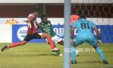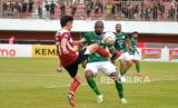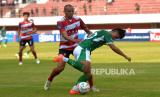 Penyerang PSS Sleman, Hokky Caraka mencoba menerobos bek tengah Madura United Cleberson pada pertandingan pekan ke-13 BRI Liga 1 2023/ 2024 di Stadion Maguwoharjo, Sleman, Yogyakarta, Ahad (24/9/2023). PSS Sleman harus berbagi poin dengan Madura United usai bermain imbang 1-1. Madura United masih kokoh di puncak klasemen BRI Liga 1 dengan 27 poin dari 13 pertandingan. (FOTO : Republika/Wihdan Hidayat)