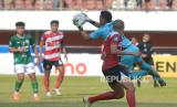 Kiper Madura United, Wawan Hendrawan menangkap bola lambung pemain PSS Sleman pada pertandingan pekan ke-13 BRI Liga 1 2023/ 2024 di Stadion Maguwoharjo, Sleman, Yogyakarta, Ahad (24/9/2023). PSS Sleman harus berbagi poin dengan Madura United usai bermain imbang 1-1. Madura United masih kokoh di puncak klasemen BRI Liga 1 dengan 27 poin dari 13 pertandingan. (FOTO : Republika/Wihdan Hidayat)