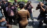 REPUBLIKA.CO.ID, JAKARTA -- Pemeran film dewasa Fransisca Candra Novitasari atau Siskaeee bersiap menjalani pemeriksaan di Mapolda Metro Jaya, Jakarta, Senin (25/9/2023).