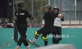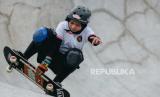 REPUBLIKA.CO.ID,  HANGZHOU  --  Altlet skateboard Indonesia Nyimas Bunga Cinta melakukan trik pada final putri Asian Games 2022 di Qiantang Roller Sports Centre, Hangzhou, China, Senin (25/9/2023).