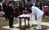 REPUBLIKA.CO.ID, KALIMANTAN TENGAH -- Gubernur Kalimantan Tengah (Kalteng) Sugianto Sabran (kiri) atas nama Presiden RI lantik bacakan pengucapan sumpah/janji jabatan Penjabat (Pj) Bupati 9 Kabupaten dan 1 Kota di Provinsi Kalteng, bertempat di Aula Jayang Tingang, Kantor Gubernur Kalteng, Senin (25/9/2023).