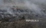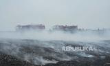 Petugas pemadam kebakaran melakukan pendinginan di asap sisa kebakaran TPS (Tempat Pembuangan Sampah) ilegal di samping Tol Cibitung-Cilincing, Desa Sumber Jaya, Tambun Utara, Kabupaten Bekasi, Jawa B (FOTO : AP Photo/Achmad Ibrahim)
