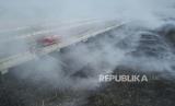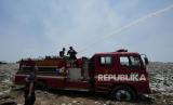 Petugas pemadam kebakaran melakukan pendinginan di asap sisa kebakaran TPS (Tempat Pembuangan Sampah) ilegal di samping Tol Cibitung-Cilincing, Desa Sumber Jaya, Tambun Utara, Kabupaten Bekas (FOTO : AP Photo/Achmad Ibrahim)