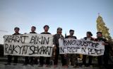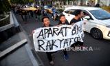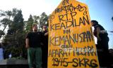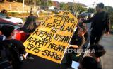 Aliansi Mahasiswa UGM melakukan aksi unjuk rasa di Bundaran UGM, Yogyakarta, Senin (25/9/2023). Pada aksi ini mereka mengangkat tema September nestapa : rekoleksi kejahatan negara. Untuk merespon banyaknya tindakan represif aparatur negara dan banyaknya kasus agraria seperti Dago Elos, Rempang, Wadas, dan lainnya. Selain itu, juga tuntuk mengingatkan kembali kasus-kasus HAM yang tidak diselesaikan oleh negara. (FOTO : Republika/Wihdan Hidayat)