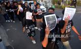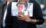 Peserta aksi dari Aliansi Mahasiswa UGM membawa foto Wiji Thukul saat unjuk rasa di Bundaran UGM, Yogyakarta, Senin (25/9/2023). Pada aksi ini mereka mengangkat tema September nestapa : rekoleksi kejahatan negara. Untuk merespon banyaknya tindakan represif aparatur negara dan banyaknya kasus agraria seperti Dago Elos, Rempang, Wadas, dan lainnya. Selain itu, juga tuntuk mengingatkan kembali kasus-kasus HAM yang tidak diselesaikan oleh negara. (FOTO : Republika/Wihdan Hidayat)