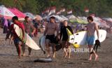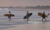 Sejumlah wisatawan membawa papan selancar saat berlibur di Pantai Kuta, Badung, Bali, Senin (25/9/2023). Kepala Dinas Pariwisata Provinsi Bali Tjok Bagus Pemayun mengatakan untuk retribusi sebesar Rp150 ribu kepada turis asing yang masuk Pulau Dewata diterapkan mulai Februari 2024 dan mekanismenya serta tata cara pungutan uang kepada turis asing hingga saat ini masih disusun dalam Peraturan Gubernur (Pergub) Bali. (FOTO : Antara/Nyoman Hendra Wibowo)