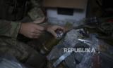 Seorang tentara Ukraina menyiapkan bom untuk dipasang pada drone yang meledak di pinggiran Kremmina, Ukraina, beberapa waktulalu. (FOTO : AP Photo/Bram Janssen)