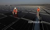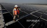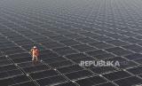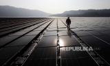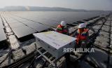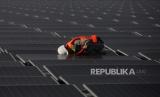Teknisi memeriksa solar panel pada proyek PLTS Terapung di Waduk Cirata, Kabupaten Purwakarta, Jawa Barat, Selasa (26/9/2023). PLTS terapung terbesar se-Asia Tenggara berkapasitas 192 megawatt peak (MWp) itu terbentang di area seluas 200 hektar yang terbangun dalam 13 blok dengan lebih dari 340.000 solar panel. PLTS tersebut mampu memproduksi 245 juta kWh energi bersih per tahun dan dapat melistriki lebih dari 50.000 rumah serta menekan emisi karbon lebih dari 200.000 ton per tahun. (FOTO : Republika/Putra M. Akbar)