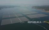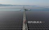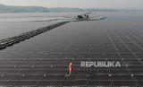 Sejumlah solar panel pada proyek PLTS Terapung di Waduk Cirata, Kabupaten Purwakarta, Jawa Barat, Selasa (26/9/2023). PLTS terapung terbesar se-Asia Tenggara berkapasitas 192 megawatt peak (MWp) itu terbentang di area seluas 200 hektar yang terbangun dalam 13 blok dengan lebih dari 340.000 solar panel. PLTS tersebut mampu memproduksi 245 juta kWh energi bersih per tahun dan dapat melistriki lebih dari 50.000 rumah serta menekan emisi karbon lebih dari 200.000 ton per tahun. (FOTO : Republika/Putra M. Akbar)