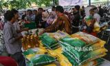 Petugas melayani warga menukarkan kupon bantuan sosial saat operasi gerakan pasar murah dan bansos di Kantor PW Muhammadiyah Jateng, Semarang, Jawa Tengah, Selasa (26/9/2023). Program yang digelar Kementerian Perdagangan, Badan Pangan Nasional, Bulog Jateng, dan PW Muhammadiyah Jateng dengan membagikan bantuan sosial ratusan sak beras berisi 5 kilogram, minyak goreng 1 liter serta mensubsidi berbagai bahan pangan itu untuk membantu warga kurang mampu memenuhi kebutuhan pokok sehari-hari. (FOTO : ANTARA ANTARA FOTO/Makna Zaezar)