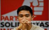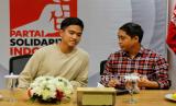 Ketua umum Partai Solidaritas Indonesia (PSI) Kaesang Pangarep (kiri) didampingi dan Sekjen PSI Raja Juli Antoni (kanan) saat menggelar rapat perdana dengan sejumlah jajaran pengurus PSI di DPP PSI, Jakarta, Selasa (26/9/2023). Rapat perdana tersebut digelar usai putra bungsu Presiden Joko Widodo, Kaesang Pangarep didapuk sebagai Ketua Umum PSI pada Kopdarnas PSI pada Senin (25/9) kemarin. Rapat tersebut membahas mengenai berbagai evaluasi dan rancangan strategi PSI dalam menghadapi Pemilu 2024. (FOTO : Republika/Thoudy Badai)