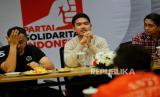 Ketua umum Partai Solidaritas Indonesia (PSI) Kaesang Pangarep (tengah) didampingi Dewan Pembina PSI Giring Ganesha (kiri) dan Sekjen PSI Raja Juli Antoni (kanan) saat menggelar rapat perdana dengan sejumlah jajaran pengurus PSI di DPP PSI, Jakarta, Selasa (26/9/2023). Rapat perdana tersebut digelar usai putra bungsu Presiden Joko Widodo, Kaesang Pangarep didapuk sebagai Ketua Umum PSI pada Kopdarnas PSI pada Senin (25/9) kemarin. Rapat tersebut membahas mengenai berbagai evaluasi dan rancangan strategi PSI dalam menghadapi Pemilu 2024. (FOTO : Republika/Thoudy Badai)
