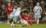 Pemain Crystal Palace Jairo Riedewald (kiri) berebut bola dengan Hannibal Mejbri dari Manchester United saat pertandingan sepak bola putaran ketiga Piala Liga Inggris antara Manchester United dan Crystal Palace di stadion Old Trafford di Manchester, Inggris, Selasa, (26/9/2023). (FOTO : AP Photo/Dave Thompson)