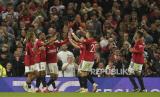 Pemain Manchester United Anthony Martial (kedua kiri) melakukan selebrasi bersama timnya setelah mencetak gol ketiga timnya pada pertandingan sepak bola putaran ketiga Piala Liga Inggris antara Manchester United dan Crystal Palace di stadion Old Trafford di Manchester, Inggris, Selasa, (26/9/2023). (FOTO : AP Photo/Dave Thompson)