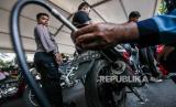 Petugas melakukan uji emisi kendaraan motor di kawasan Gelora Bung Karno, Jakarta, Rabu (27/9/2023). Dinas Lingkungan Hidup DKI Jakarta dan Ditlantas Polda Metro Jaya akan kembali melakukan razia dan tilang emisi kendaraan di tempat pada bulan Oktober. Selain itu, Pemprov DKI Jakarta juga akan menerapkan tarif disinsentif di 131 titik lokasi parkir bagi kendaraan yang tidak lulus uji emisi. (FOTO : Republika/Putra M. Akbar)