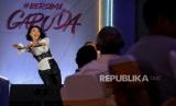 Penyanyi Wika Salim membawakan lagu Bersama Garuda saat peluncuran dalam acara PSSI Partner Summit di Jakarta, Rabu (27/9/2023). Acara PSSI Partner Summit tersebut merupakan bentuk dukungan dari sejumlah mitra sponsorship untuk berkontribusi dalam memajukan persepakbolaan di Indonesia. Selain itu, kegiatan tersebut sekaligus peluncuran aplikasi Kita Garuda yang memuat informasi tentang sepakbola Indonesia dan penjualan tiket pertandingan juga peluncuran lagu Bersama Garuda oleh penyanyi Wika Salim, dan fashion show dari pemain Timnas Putri Indonesia. (FOTO : Republika/Thoudy Badai)