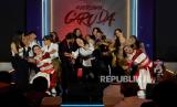 Penyanyi Wika Salim bersama pemain Timnas Putri Indonesia membawakan lagu Bersama Garuda saat peluncuran dalam acara PSSI Partner Summit di Jakarta, Rabu (27/9/2023). Acara PSSI Partner Summit tersebut merupakan bentuk dukungan dari sejumlah mitra sponsorship untuk berkontribusi dalam memajukan persepakbolaan di Indonesia. Selain itu, kegiatan tersebut sekaligus peluncuran aplikasi Kita Garuda yang memuat informasi tentang sepakbola Indonesia dan penjualan tiket pertandingan juga peluncuran lagu Bersama Garuda oleh penyanyi Wika Salim, dan fashion show dari pemain Timnas Putri Indonesia. (FOTO : Republika/Thoudy Badai)