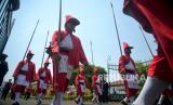 Pasukan Bregada mengawal gunungan Garebeg Maulud saat acara puncak Sekaten Keraton Yogyakarta di Keraton Yogyakarta, Kamis (28/9/2023). Garebeg Maulud yang diadakan setiap 12 Rabiul Awal atau Maulud sebagai perayaan hari lahir Nabi Muhammad yang selalu dinantikan oleh masyarakat dan wisatawan. Garebeg Maulud ini sebagai wujud syukur dan sedekah dari Keraton Yogyakarta atas berkah kemakmuran yang dapat dinikmati bersama masyarakat. Acara puncak ini merupakan rangkaian perayaan Sekaten yang pada awalnya digunakan sebagai sarana dakwah oleh Sri Sultan HB I. Ada tujuh gunungan yang dibagikan kepada masyarakat, sedangkan yang dua masing-masing diberikan ke Kepatihan dan Pura Pakualaman. (FOTO : Republika/Wihdan Hidayat)