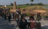REPUBLIKA.CO.ID, KLATEN -- Warga membawa gunungan hasil panen padi pada tradisi Wiwitan Panen Padi di Delanggu, Klaten, Jawa Tengah, Jumat (29/9/2023).