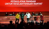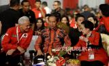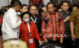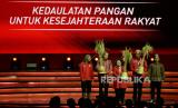 REPUBLIKA.CO.ID,JAKARTA -- Presiden Joko Widodo (dua kiri), Ketua Umum PDIP Megawati Soekarnoputri (tengah) dan Bakal Calon Presiden Ganjar Pranowo (dua kanan) dengan membawa bibit padi berfoto dengan para petani dalam pembukaan Rakernas IV PDIP di JIExpo Kemayoran, Jakarta, Jumat (29/9/2023). Rakernas IV PDIP tersebut mengangkat tema Kedaulatan Pangan Untuk Kesejahteraan Rakyat Indonesia. Rakernas akan berlangsung hingga Ahad (1/10/2023).