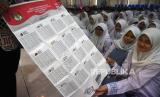 REPUBLIKA.CO.ID, BOGOR -- Siswa memperhatikan contoh surat suara saat sosialisasi Pemilu 2024 untuk pemilih pemula di MAN 2 Kota Bogor, Jawa Barat, Jumat (29/9/2023).
