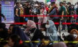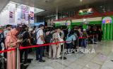 Sejumlah pengunjung mengantre untuk memasuki area acara KAI Expo 2023 di Jakarta Convention Center, Jakarta, Sabtu (30/9/2023). KAI Expo 2023 menyediakan 73.500 tiket promo kereta api jarak jauh untuk berbagai perjalanan kereta api jarak jauh luxury, eksekutif, bisnis dan ekonomi dengan harga mulai dari Rp 50.000 hingga Rp 300.000 untuk keberangkatan 1-31 Oktober 2023. (FOTO : Republika/Putra M. Akbar)