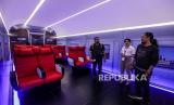 Sejumlah pengunjung berada di salah satu stan berbentuk ruangan kereta cepat pada acara KAI Expo 2023 di Jakarta Convention Center, Jakarta, Sabtu (30/9/2023). KAI Expo 2023 menyediakan 73.500 tiket promo kereta api jarak jauh untuk berbagai perjalanan kereta api jarak jauh luxury, eksekutif, bisnis dan ekonomi dengan harga mulai dari Rp 50.000 hingga Rp 300.000 untuk keberangkatan 1-31 Oktober 2023. (FOTO : Republika/Putra M. Akbar)