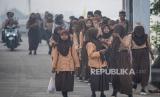 Sejumlah pelajar berjalan menuju sekolah di Palembang, Sumatera Selatan, Sabtu (30/9/2023). Dinas Pendidikan Kota Palembang mengurangi waktu kegiatan belajar siswa TK,SD dan SMP mulai pukul 09:00 WIB dan mentiadakan kegiatan diluar kelas seperti olahraga, upacara, ekstrakurikuler akibat dampak buruk bencana kabut asap yang melanda kota Palembang. (FOTO : Antara/Nova Wahyudi)