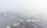 REPUBLIKA.CO.ID, PALEMBANG -- Foto udara Jembatan Ampera yang tertutup kabut asap di Palembang, Sumatra Selatan, Ahad (1/10/2023). Berdasarkan data dari Badan Meteorologi, Klimatologi, dan Geofisika kualitas udara di Palembang berada di level berbahaya dampak dari kebakaran hutan dan lahan (karhutla) yang terjadi di kabupaten/kota di Provinsi Sumatra Selatan.
