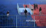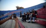 Jurnalis memotret proses renovasi Stadion Kanjuruhan di Malang, Jawa Timur, Ahad (1/10/2023). (FOTO : Republika/Wihdan Hidayat)