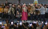 Sejumlah Menteri Kabinet Indonesia Maju mengajak Presiden Joko Widodo dan Ibu Negara Iriana Joko Widodo berswafoto dalam acara Istana Berbatik di depan Istana Merdeka, Jakarta, Minggu (1/10/2023).