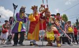 Sejumlah peserta berkostum tokoh kisah Perjalanan ke Barat Mencari Kitab Suci mengikuti kirab budaya Jut Bio atau Ruwat Bumi di Kota Magelang, Jateng, Ahad (1/10/2023). (FOTO : ANTARA FOTO/ANIS EFIZUDIN)