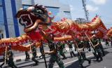 Peserta menampilkan tarian Liong sepanjang 120 meter saat kirab budaya Jut Bio atau Ruwat Bumi di Kota Magelang, Jateng, Ahad (1/10/2023). (FOTO : ANTARA FOTO/ANIS EFIZUDIN)