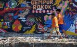 REPUBLIKA.CO.ID,SOLO -- Warga melewati mural bertema Gempur Rokok Ilegal di Solo, Jawa Tengah, Senin (2/10/2023).