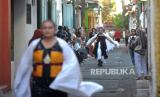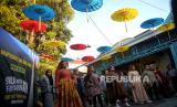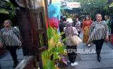 Peragawati memamerkan pakaian batik saat Pre Event Solo Batik Show XV di Kampung Batik Kauman, Surakarta, Jawa Tengah, Senin (2/10/2023). Peragaan busana batik ini juga untuk memeriahkan Hari Batik Nasional. Ada delapan desainer batik yang mengikuti acara pendahuluan untuk Solo Batik Show 2023 nanti. Berbagai bentuk busana dari bahan batik diperagakan di jalan kampung yang disulap menjadi catwalk. (FOTO : Republika/Wihdan Hidayat)