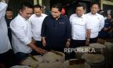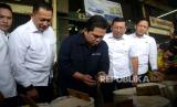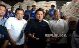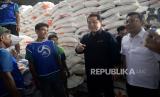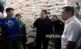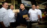 Menteri BUMN Erick Thohir bersama Kepala Badan Pangan Nasional Arief Prasetyo Adi saat kunjungan ke Pasar Induk Beras Cipinang, Jakarta, Rabu (4/10/2023). Kunjungan tersebut dalam rangka peninjauan operasi pasar beras SPHP. Kegiatan ini merupakan upaya pemerintah dalam Stabilisasi pasokan dan harga pangan khususnya beras. (FOTO : Republika/Prayogi)