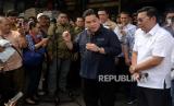 Menteri BUMN Erick Thohir bersama Kepala Badan Pangan Nasional Arief Prasetyo Adi dan Dirut Perum Bulog Budi Waseso saat kunjungan ke Pasar Induk Beras Cipinang, Jakarta, Rabu (4/10/2023). Kunjungan tersebut dalam rangka peninjauan operasi pasar beras SPHP. Kegiatan ini merupakan upaya pemerintah dalam Stabilisasi pasokan dan harga pangan khususnya beras. (FOTO : Republika/Prayogi)