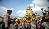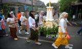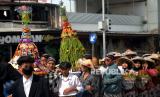 Pelajar SMPN 8 Yogyakarta membawa gunungan saat karnaval menyambut HUT ke-267 Kota Yogyakarta di kawasan Kotabaru, Yogyakarta, Rabu (4/10/2023). Untuk menyambut HUT ke-267 Kota Yogyakarta berbagai sekolah kompak melakukan karnaval dengan berbagai tema. HUT Kota Yogyakarta pada tahun ini mengangkat tema Tatag, Teteg, Tutug yang juga berarti semangat dan harapan dalam melayani masyarakat. Mereka melakukan karnaval dengan berkeliling di seputar sekolah berada. Mulai dari kostum pelaku seni, pahlawan, petani, hingga busana tradisional digunakan oleh pelajar saat karnaval. (FOTO : Republika/Wihdan Hidayat)