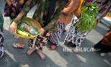 Pelajar SMPN 6 Yogyakarta menggunakan kostum kesenian Gedruk saat karnaval menyambut HUT ke-267 Kota Yogyakarta di Tugu Pal Putih, Yogyakarta, Rabu (4/10/2023). Untuk menyambut HUT ke-267 Kota Yogyakarta berbagai sekolah kompak melakukan karnaval dengan berbagai tema. HUT Kota Yogyakarta pada tahun ini mengangkat tema Tatag, Teteg, Tutug yang juga berarti semangat dan harapan dalam melayani masyarakat. Mereka melakukan karnaval dengan berkeliling di seputar sekolah berada. Mulai dari kostum pelaku seni, pahlawan, petani, hingga busana tradisional digunakan oleh pelajar saat karnaval. (FOTO : Republika/Wihdan Hidayat)