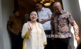 Ketua DPP Partai Demokrasi Indonesia Perjuangan (PDIP) sekaligus Ketua DPR Puan Maharani usai bersilaturahmi dengan Wakil Presiden ke-10 dan ke-12 Jusuf Kalla (JK) di kediaman JK, Kebayoran Baru, Jakarta, Rabu (4/10/2023). Silaturahmi Puan ke politisi senior Partai Golkar tersebut juga membahas perkembangan situasi politik dan kenegaraan terkini di Indonesia. (FOTO : Republika/Prayogi)