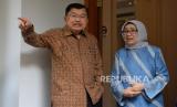 Wakil Presiden ke-10 dan ke-12 Jusuf Kalla (JK) didampingi Mufidah Jusuf Kalla usai menerima silaturahmi Ketua DPP Partai Demokrasi Indonesia Perjuangan (PDIP) sekaligus Ketua DPR Puan Maharani di kediaman JK, Kebayoran Baru, Jakarta, Rabu (4/10/2023). Silaturahmi Puan ke politisi senior Partai Golkar tersebut juga membahas perkembangan situasi politik dan kenegaraan terkini di Indonesia. (FOTO : Republika/Prayogi)