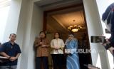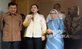 Ketua DPP Partai Demokrasi Indonesia Perjuangan (PDIP) sekaligus Ketua DPR Puan Maharani (tengah) bersama Wakil Presiden ke-10 dan ke-12 Jusuf Kalla (JK) didampingi Mufidah Jusuf Kalla menyampaikan keterangan kepada wartawan usai silaturahmi di kediaman JK, Kebayoran Baru, Jakarta, Rabu (4/10/2023). Silaturahmi Puan ke politisi senior Partai Golkar tersebut juga membahas perkembangan situasi politik dan kenegaraan terkini di Indonesia. (FOTO : Republika/Prayogi)
