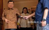 Ketua DPP Partai Demokrasi Indonesia Perjuangan (PDIP) sekaligus Ketua DPR Puan Maharani bersama Wakil Presiden ke-10 dan ke-12 Jusuf Kalla (JK) bersiap menyampaikan keterangan kepada wartawan usai silaturahmi di kediaman JK, Kebayoran Baru, Jakarta, Rabu (4/10/2023). Silaturahmi Puan ke politisi senior Partai Golkar tersebut juga membahas perkembangan situasi politik dan kenegaraan terkini di Indonesia. (FOTO : Republika/Prayogi)