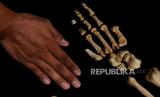 Pengunjung membandingkan replika kaki dari Homo Floresiensis menggunakan telapak tangan saat berkunjung ke kawasan Sains RP Soejono, BRIN, Pejaten, Pasar Minggu, Jakarta Selatan, Rabu (4/10/2023). Badan Riset dan Inovasi Nasional (BRIN) memperingati 20 tahun penemuan fosil manusia purba atau Homo Floresiensis. Pameran tersebut bertajuk The Commemoration of the 20th Anniversary of Homo Floresiensis Discovery dengan menyajikan pameran fosil serta diksusi ilmiah bersama arkeolog nasional dan luar negeri terkait penemuan fosil Homo Floresiensis. The Hobit Flores atau manusia purba kerdil asal Flores tersebut memiliki keunikan karena bentuk tengkoraknya yang lebih kecil dari tengkorak manusia modern dan juga memiliki tinggi badan 106 centimeter dengan bobot tubuh 27,5 kilogram. Homo Floresiensis ditemukan di situs Liang Boa yang merupakan gua di perbukitan karst Kabupaten Manggarai, Flores pada tahun 2003. Meski demikian proses penelitaian tersebut sudah berlangsung dari tahun 1965. Berdasarkan hasil uji laboratorium, fosil Homo Floresiensis berusia sekitar tiga puluhan ribu tahun yang lalu. (FOTO : Republika/Thoudy Badai)
