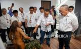 Penemu fosil Homo Floresiensis Thomas Sutikna (kedua kanan) berbincang dengan Kepala BRIN Laksana Tri Handoko (kanan) menjelaskan terkait patung rekontruksi Homo Floresiensis di kawasan Sains RP Soejono, BRIN, Pejaten, Pasar Minggu, Jakarta Selatan, Rabu (4/10/2023). Badan Riset dan Inovasi Nasional (BRIN) memperingati 20 tahun penemuan fosil manusia purba atau Homo Floresiensis. Pameran tersebut bertajuk The Commemoration of the 20th Anniversary of Homo Floresiensis Discovery dengan menyajikan pameran fosil serta diksusi ilmiah bersama arkeolog nasional dan luar negeri terkait penemuan fosil Homo Floresiensis. The Hobit Flores atau manusia purba kerdil asal Flores tersebut memiliki keunikan karena bentuk tengkoraknya yang lebih kecil dari tengkorak manusia modern dan juga memiliki tinggi badan 106 centimeter dengan bobot tubuh 27,5 kilogram. Homo Floresiensis ditemukan di situs Liang Boa yang merupakan gua di perbukitan karst Kabupaten Manggarai, Flores pada tahun 2003. Meski demikian proses penelitaian tersebut sudah berlangsung dari tahun 1965. Berdasarkan hasil uji laboratorium, fosil Homo Floresiensis berusia sekitar tiga puluhan ribu tahun yang lalu. (FOTO : Republika/Thoudy Badai)