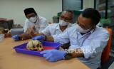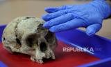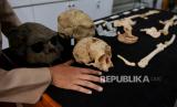 Penemu fosil Homo Floresiensis Thomas Sutikna mengamati hasil penemuan fosil tengkorak Homo Floresiensis di kawasan Sains RP Soejono, BRIN, Pejaten, Pasar Minggu, Jakarta Selatan, Rabu (4/10/2023). Badan Riset dan Inovasi Nasional (BRIN) memperingati 20 tahun penemuan fosil manusia purba atau Homo Floresiensis. Pameran tersebut bertajuk The Commemoration of the 20th Anniversary of Homo Floresiensis Discovery dengan menyajikan pameran fosil serta diksusi ilmiah bersama arkeolog nasional dan luar negeri terkait penemuan fosil Homo Floresiensis. The Hobit Flores atau manusia purba kerdil asal Flores tersebut memiliki keunikan karena bentuk tengkoraknya yang lebih kecil dari tengkorak manusia modern dan juga memiliki tinggi badan 106 centimeter dengan bobot tubuh 27,5 kilogram. Homo Floresiensis ditemukan di situs Liang Boa yang merupakan gua di perbukitan karst Kabupaten Manggarai, Flores pada tahun 2003. Meski demikian proses penelitaian tersebut sudah berlangsung dari tahun 1965. Berdasarkan hasil uji laboratorium, fosil Homo Floresiensis berusia sekitar tiga puluhan ribu tahun yang lalu. (FOTO : Republika/Thoudy Badai)